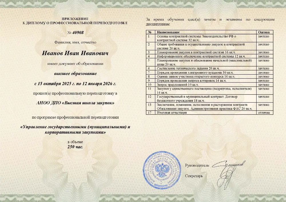 Программа профессиональной переподготовки на 500 академических часов для специалистов по закупкам по 44-ФЗ и 223-ФЗ. Данный курс охватывает полный цикл закупочной деятельности, проходит в дистанционном формате с практической направленностью. По итогам выдается диплом о профессиональной переподготовке с присвоением квалификации.